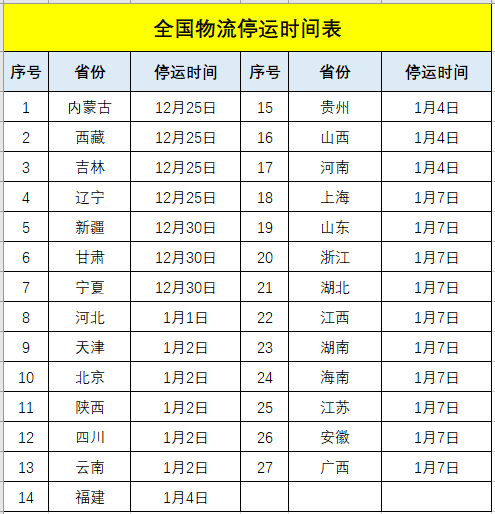 由于天氣寒冷以及霧霾天氣嚴(yán)重,今年全國(guó)物流停運(yùn)時(shí)間比往年來得早?;趪?guó)家交通部、物流部等部門發(fā)出的通知,距離物流停運(yùn)時(shí)間不多了,部分區(qū)域物流將于1月5日開始陸續(xù)放假停運(yùn),1月18日將全國(guó)大范圍停運(yùn)。